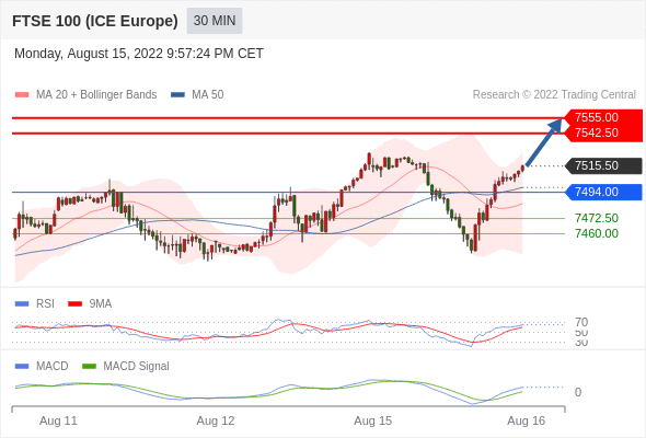 RSI技术指标超过50。 MACD技术指标呈现看多状态并 处在其信号线的上方。 此外,价位高于其20个时期及50个时期移动平均线 ( 分别位于 7484.88 和 7498.01 )。