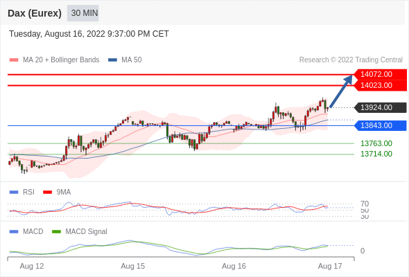 德国DAX指数期货 (Eurex)? 当日内: 看涨,当 13843.00 为支撑位。
