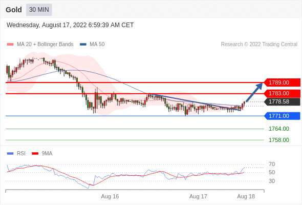 在 1771.00 之上,看涨,目标价位为 1783.00 ,然后为 1789.00 。