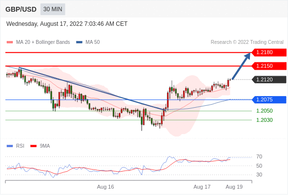 在 1.2075 之上,看涨,目标价位为 1.2150 ,然后为 1.2180 。