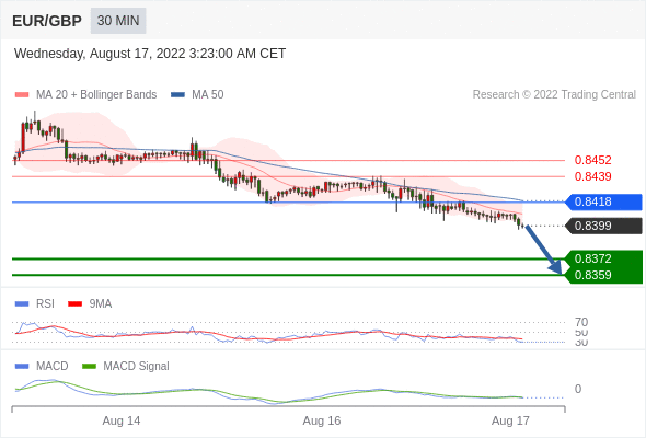 欧元/英镑 当日内: 看跌,在 0.8418 之下。
