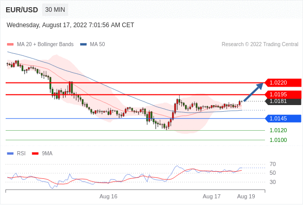 在 1.0145 之上,看涨,目标价位为 1.0195 ,然后为 1.0220 。