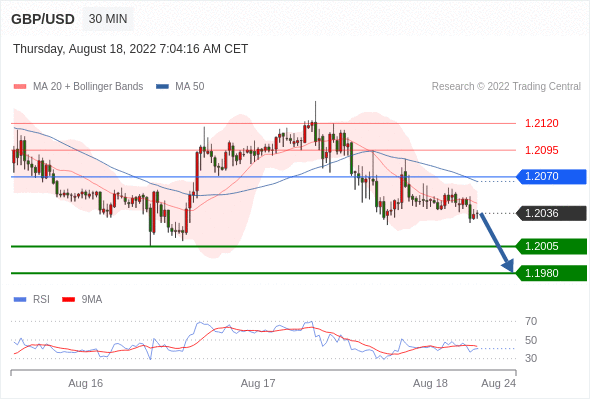 在 1.2070 之下,看跌,目标价位为 1.2005 ,然后为 1.1980 。