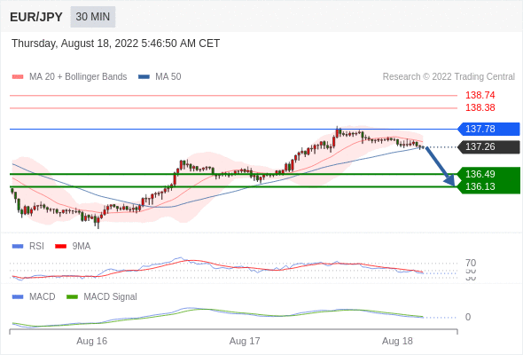 欧元/日元 当日内: 看跌,在 137.78 之下。