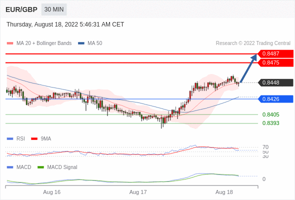 欧元/英镑 当日内: 看涨,当 0.8426 为支撑位,目标定在0.8487。