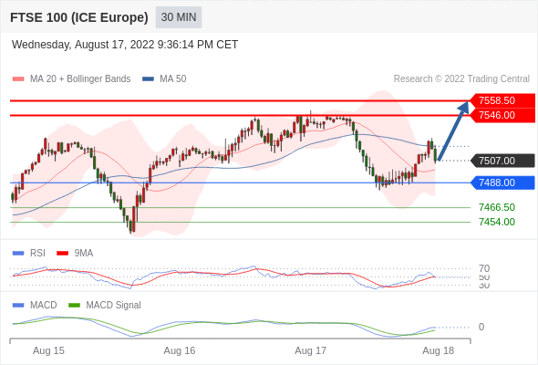 英国富时100指数期货 当日内: 有上涨的可能,目标价位定在 7558.50 。