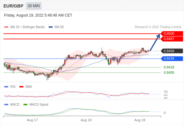 欧元/英镑 当日内: 看涨,当 0.8439 为支撑位,目标定在0.8500。