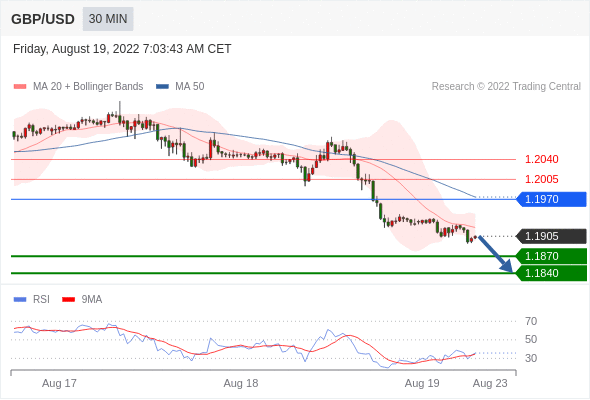 在 1.1970 之下,看跌,目标价位为 1.1870 ,然后为 1.1840 。