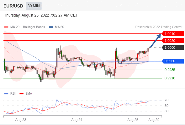 在 0.9960 之上,看涨,目标价位为 1.0020 ,然后为 1.0040 。
