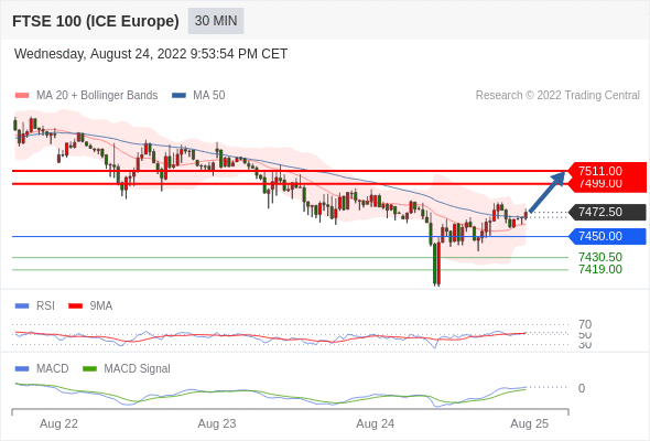 如跌破 7450 ,英国富时100指数期货 目标方向定在 7430.50 和 7419 。