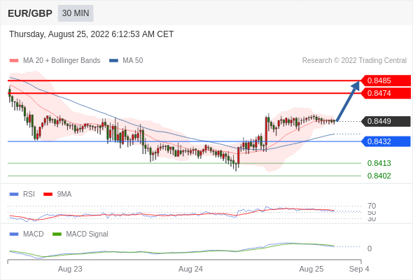 欧元/英镑 当日内: 看涨,当 0.8432 为支撑位,目标定在0.8485。