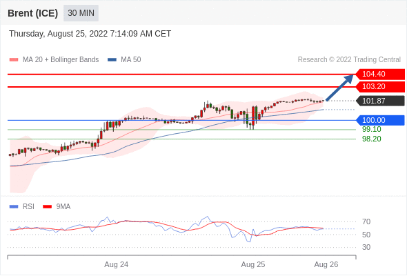 布伦特原油 (ICE)? (V2)? 当日内: 在100.00之上,看涨。