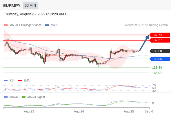 欧元/日元 当日内: 看涨,当 136.05 为支撑位,目标定在137.74。