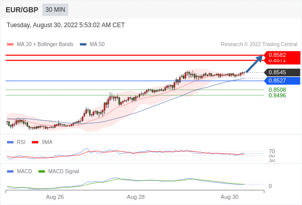 欧元/英镑 当日内: 看涨,当 0.8527 为支撑位,目标定在0.8582。