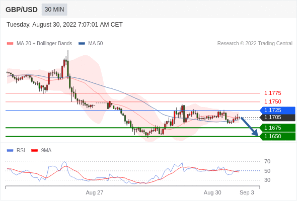 在 1.1725 之下,看跌,目标价位为 1.1675 ,然后为 1.1650 。