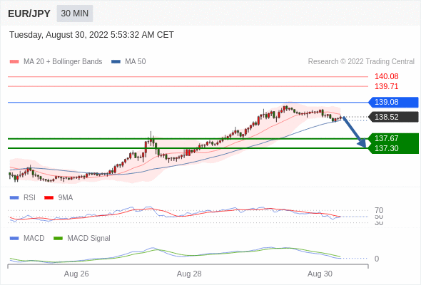 欧元/日元 当日内: 逐渐下跌,当 139.08 阻碍上行,则 137.30 为目标位。