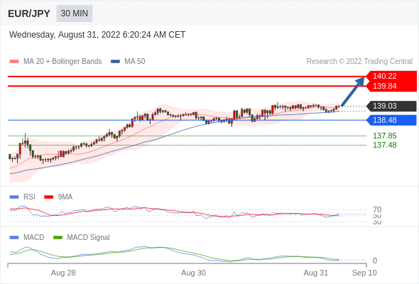 欧元/日元 当日内: 看涨,当 138.48 为支撑位,目标定在140.22。