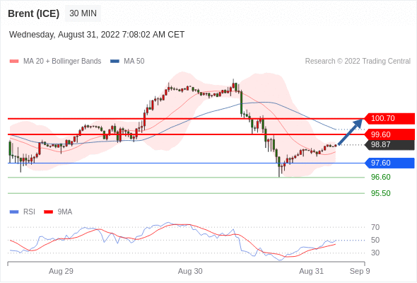 在 97.60 之上,看涨,目标价位为 99.60 ,然后为 100.70 。