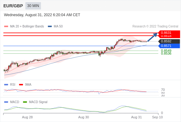 欧元/英镑 当日内: 看涨,当 0.8571 为支撑位,目标定在0.8631。