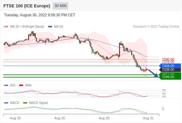 英国富时100指数期货 当日内: 看跌,在 7358.00 之下。