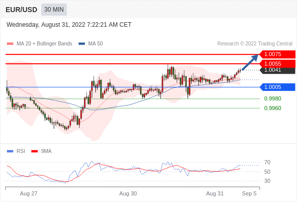 在 1.0005 之上,看涨,目标价位为 1.0055 ,然后为 1.0075 。