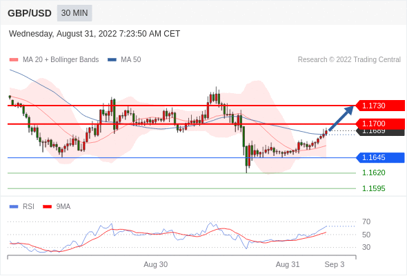在 1.1645 之上,看涨,目标价位为 1.1700 ,然后为 1.1730 。