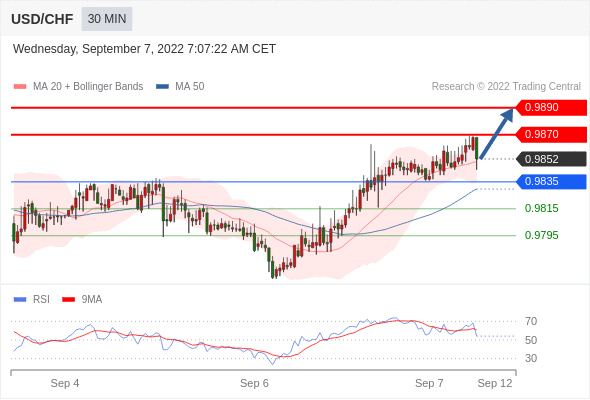 在 0.9835 之上,看涨,目标价位为 0.9870 ,然后为 0.9890 。