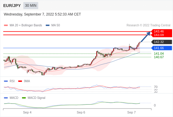 欧元/日元 当日内: 看涨,当 141.66 为支撑位。