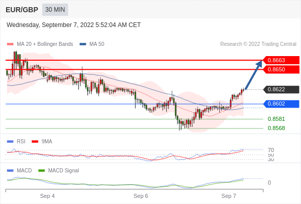 欧元/英镑 当日内: 看涨,当 0.8602 为支撑位。