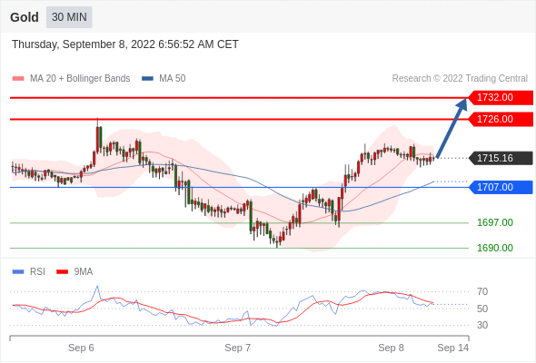 在 1707.00 之上,看涨,目标价位为 1726.00 ,然后为 1732.00 。