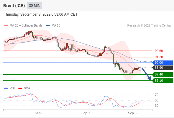布伦特原油 (ICE)? (X2)? 当日内: 短期关键阻力位在90.00。