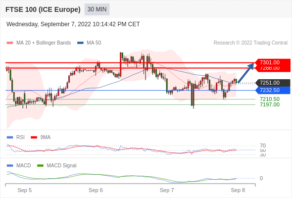 RSI技术指标超过50。 MACD技术指标呈现看多状态并 处在其信号线的上方。 此外,价位处在其20个时期及50个时期移动平均线上方 ( 当前是 7246.30 和 7248.60 )。