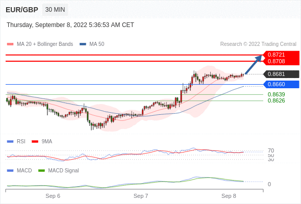 欧元/英镑 当日内: 看涨,当 0.8660 为支撑位,目标定在0.8721。