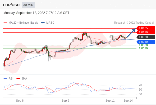 在 1.0050 之上,看涨,目标价位为 1.0110 ,然后为 1.0135 。