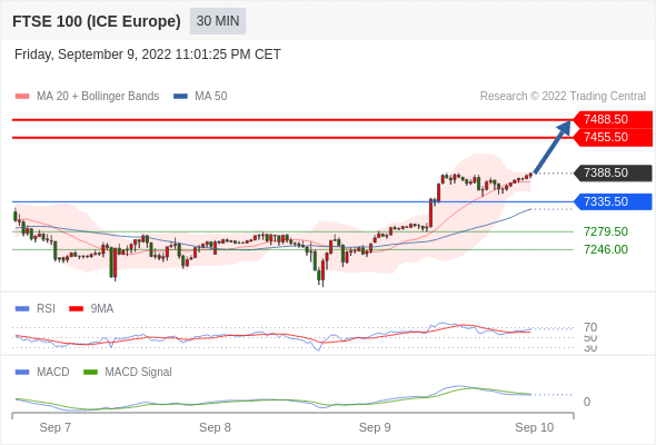 如跌破 7335.50 ,英国富时100指数期货 目标方向定在 7279.50 和 7246 。