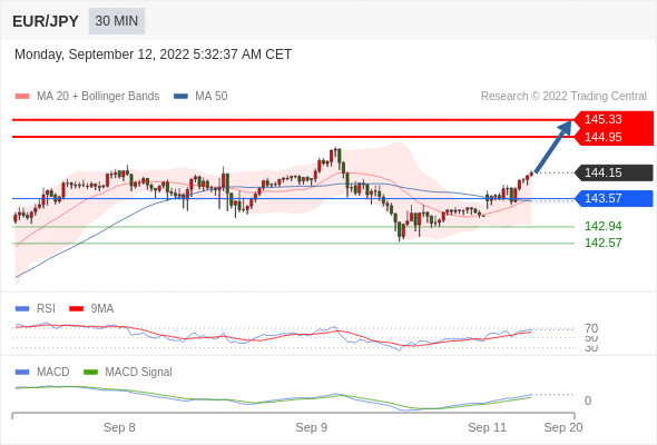 欧元/日元 当日内: 看涨,当 143.57 为支撑位。