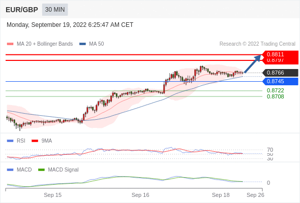欧元/英镑 当日内: 看涨,当 0.8745 为支撑位,目标定在0.8811。