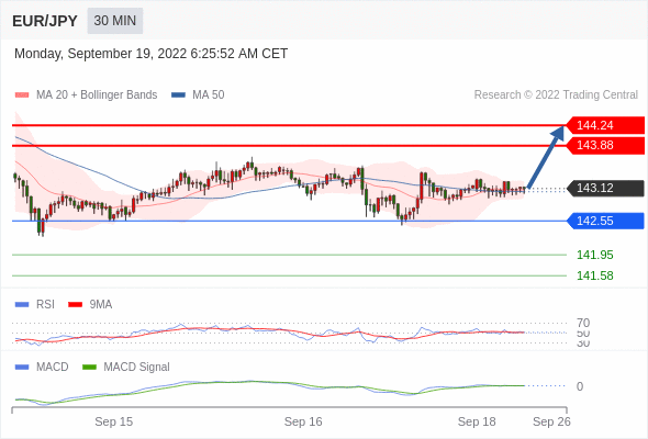 欧元/日元 当日内: 看涨,当 142.55 为支撑位,目标定在144.24。