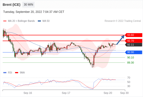 布伦特原油 (ICE)? (X2)? 当日内: 在90.90之上,看涨。