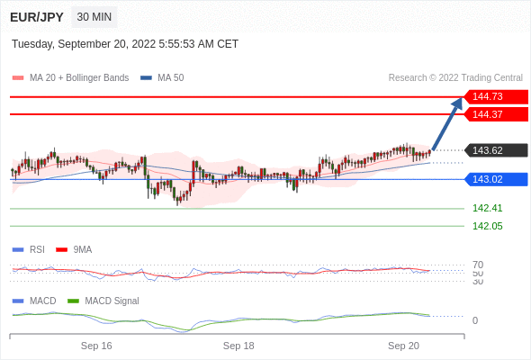 欧元/日元 当日内: 看涨,当 143.02 为支撑位,目标定在144.73。