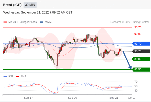 布伦特原油 (ICE)? (X2)? 当日内: 短期关键阻力位在91.70。