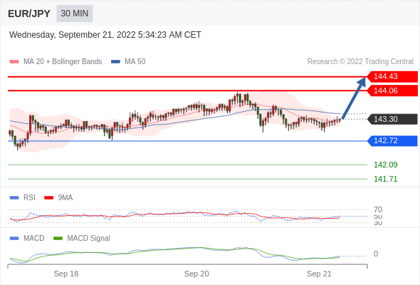向下跌破 142.72 ,将带来继续下跌的趋势,目标位为 142.09 然后为 141.71 。