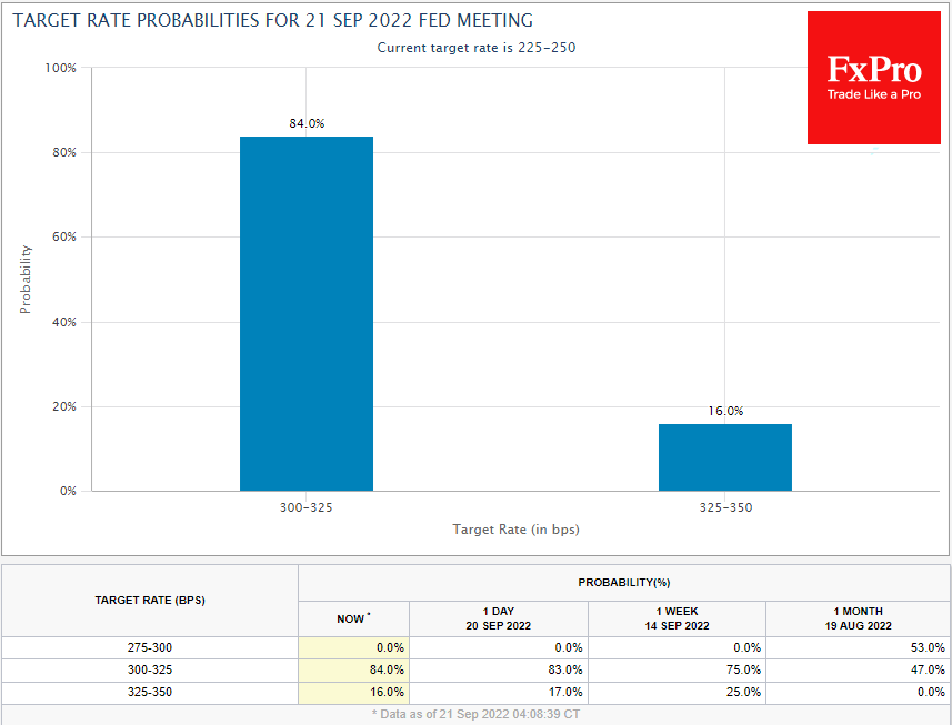 利率期货市场有84%的机会上升75点,今天有16%的机会上升100点。 这是一个非常鹰派的预期,市场自上周二以来一直在投入价格,导致对防御性资产的拉动。