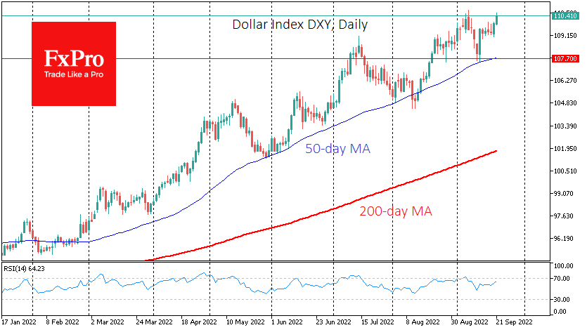 在货币市场上,美元指数已经接近本月初设定的极端水平,目前交易在110.35,而英镑兑美元、欧元兑美元和美元兑日元已经改写或接近多年来的极端水平。从这一点开始,只要轻轻一推,就会引发雪崩般的移动。一切都将取决于市场对美联储的货币政策计划。