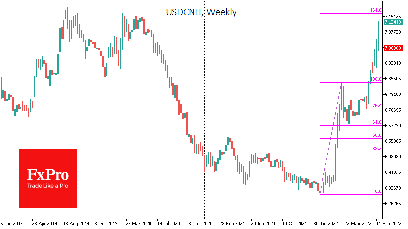 中国人民币也参与了对美元的大规模抛售。 周五上午,USDCNH离岸利率超过7.11,在短短一个多月内经历了前所未有的6%的上涨。 在中国人民银行的帮助下,人民币汇率从2019年和2020年的7.20逆转下跌,但从现在开始,人民币有可能在没有太多阻力的情况下失去最后1.2%。