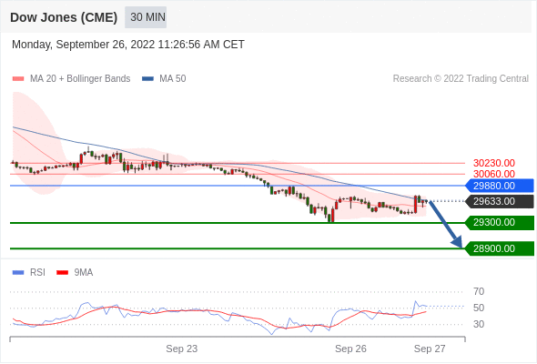 美国道琼斯指数期货 (Z2)? 当日内: 短期关键阻力位在29880.00。
