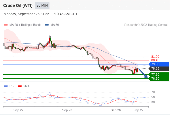 在 79.50 之下,看跌,目标价位为 77.20 ,然后为 76.30 。