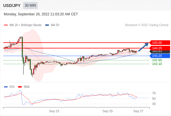 在 143.20 之上,看涨,目标价位为 144.25 ,然后为 145.00 。