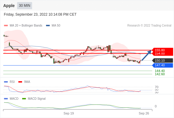 Apple 当日内: 有上涨的可能,目标价位定在 155.8 。