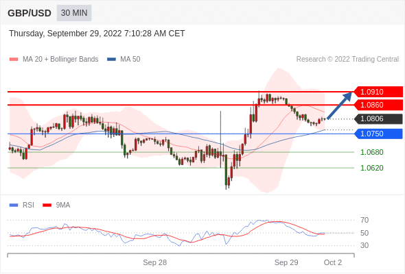 英镑/美元 当日内: 超短线(当日内)支撑位在1.0750附近。